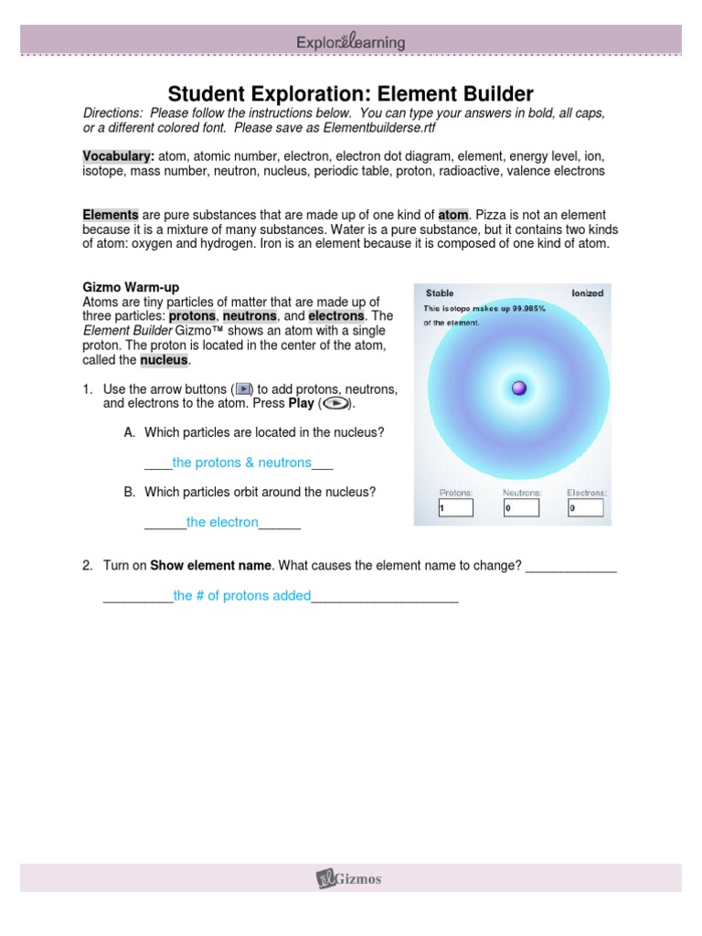 Use protons, neutrons, and electrons to build elements. Each element is classified as a. What are some of the different substances that make up a pizza? The proton is located in the center of the atom, called the nucleus. It has a negative electric charge. The proton is located in the center of the atom, called the nucleus. Prior knowledge questions (do these before using the gizmo.). The proton is located in the center of the atom, called the nucleus. Element builder gizmo worksheet answers. The element builder gizmo™ shows an atom with a single proton. The basic unit of a chemical element. Element builder gizmo answer key.pdf free pdf download 25,800 results any time (more)h them access to all gizmo lesson materials, including answer keys.